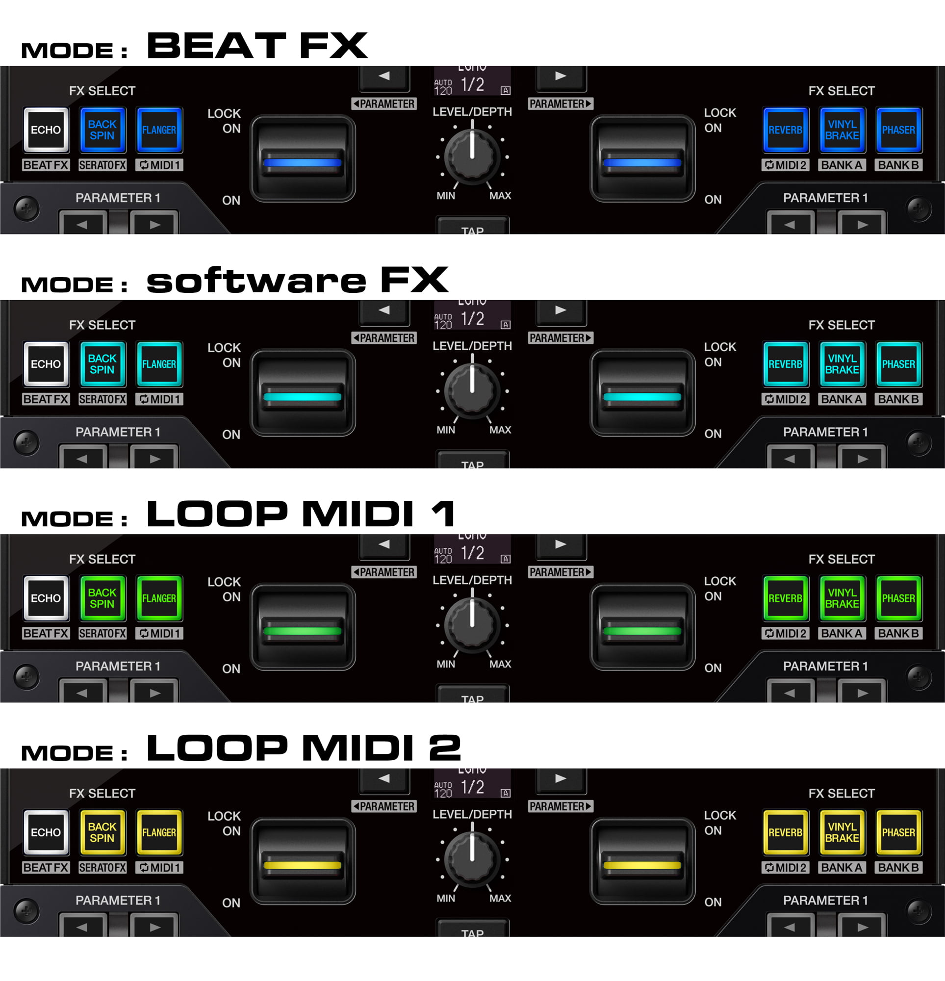 This feature in the effects section of the DJM-S7 can control various functions in your DJ software by repeatedly sending a MIDI signal to the software in a set beat cycle. Functions including Hot Cue, sampler, and key shift-up are preassigned so you can start using Loop MIDI straight away.