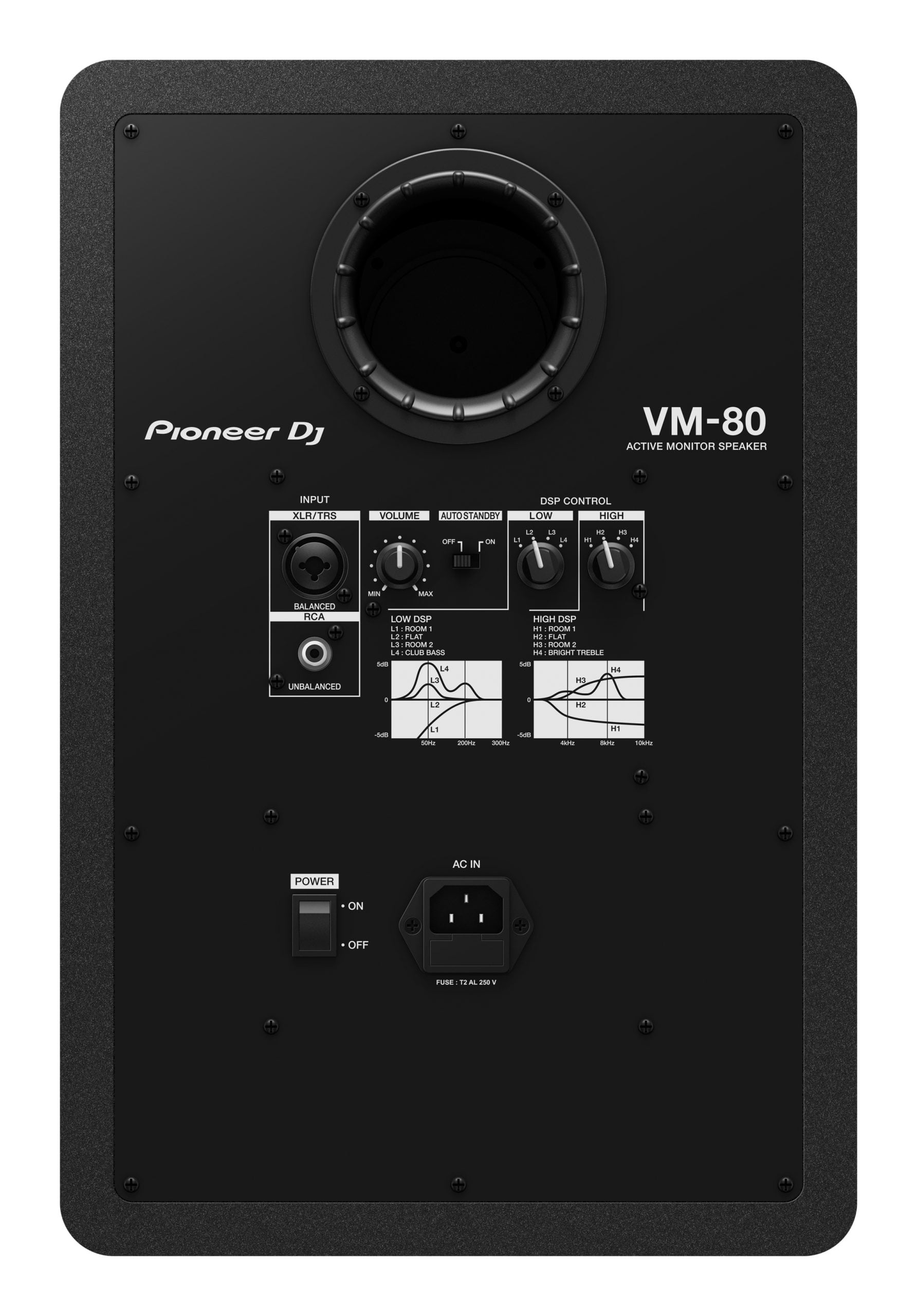 All VM series speakers are voiced flat to ensure you hear the natural sound of the music. To help you tweak the output and find the sound that’s perfect for the room you’re working in, each speaker includes DSP settings. On the rear panel, you’ll find 2 knobs: Low EQ and High EQ. Without needing to look, you can click the knobs into 4 different positions each, giving you 16 possible EQ settings that are simple to engage. Choose the one that sounds best for DJing or producing music in your home or studio, depending on the shape, size, and construction of the room.