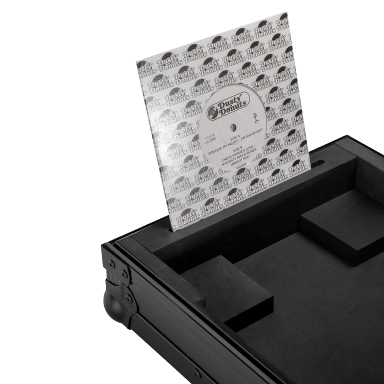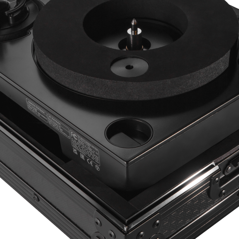 Designed for real-world use, the case features a removable lid for fast setup, an integrated 7″ cover holder for quick access to records, and a spacer ring with puck holder to lock the platter in place while protecting the spindle. Whether used directly in the case or stacked with the lid for an elevated setup height, this case delivers flexibility without compromise. Cables can be stored neatly in the lower section of the case, where the padded base provides dedicated space for accessories.